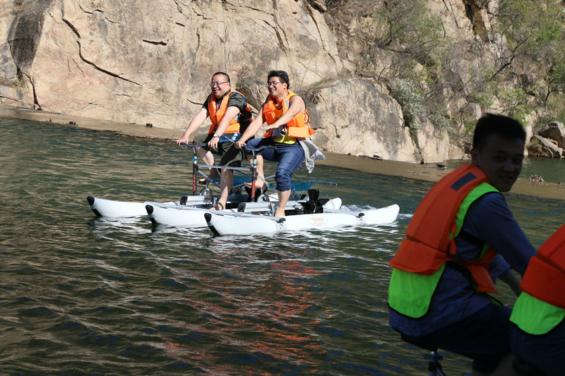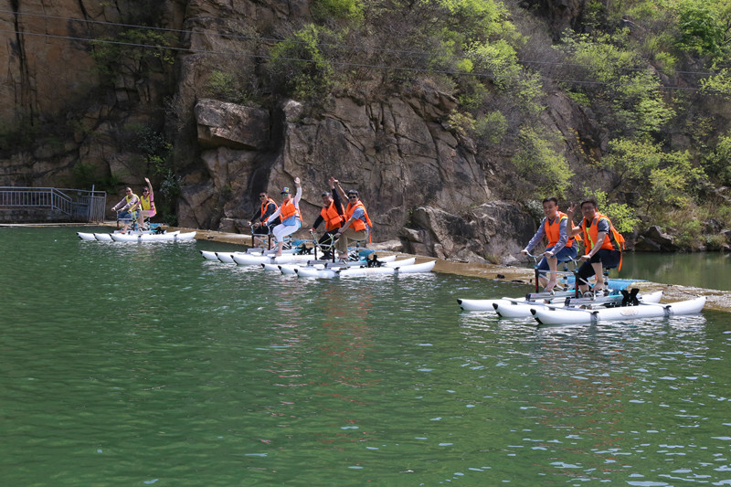 為了促進各商會會員間快速熟悉、彼此了解,充分互動,活動特別安排了登山、籃球和水上自行車比賽及篝火聯歡才藝表演等多個競技聯誼項目。登山比賽以各商會為小組,共設置四個獎項,并以抵達目的地先后順序評選出獲勝者。比賽開始后,大家穿越清涼的山澗瀑布,攀爬陡峭的垂直懸梯,各小組隊員相互鼓勵、相互幫助,即使汗流浹背,依然努力攀登,都希望為各自團隊的榮譽貢獻一份力量。經過一番比拼,北京江西企業商會理事蘇清紅脫穎而出,奪得冠軍。同時,北京江西企業商會代表隊在其他各項競技活動中均取得了好成績:籃球比賽中與廣西商會并列冠軍;水上自行車比賽中,商會理事張蓮花、何明祥在小組賽中獲得第一名。