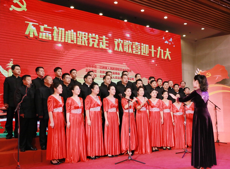 不忘初心跟黨走,贛商喜迎十九大。為迎接中國共產黨第十九次全國代表大會勝利召開,唱響主旋律,傳播正能量,提振精氣神,展示在京贛商及廣大江西鄉友開拓進取、團結協作、奮發向上的精神風貌,江西省人民政府駐北京辦事處聯合北京江西企業商會主辦的大型合唱歌詠會于9月23日在北京江西大廈舉行。來自江西省政府駐京辦,北京江西企業商會黨支部,在京贛籍行業商會、市(縣)商會,以及江西高校在京校友會等15個代表隊縱情高歌。